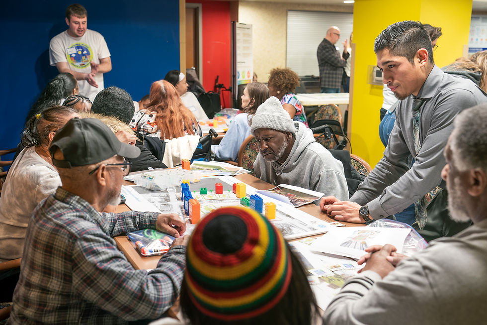 Housing Design Workshop: Residents engaged in a design exercise to reimagine Heritage Place Apartments. The community explored various possibilities for organizing open space, connections, amenities and buildings, including types of housing, with interactive blocks, and programming cards and pins.